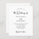 Den här enkla och snyggt, svarta och vita allt i en inbjudan till ett budgetbröllop har visemisk, vintage stil-skripttypografi och en skannerbar QR-kod så att gästerna kan OSA eller få mer information och information om bröllop. Huvudmanuset säger "bröllop av". En elegant, ett klassiskt minimalistiskt utseende som fortfarande är unikt och contemporary.