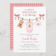 Celebrate the upcoming arrival of a little sweetheart with this charming pink teddy bear baby shower invitation. Featuring a soft gingham back, cozy clothesline details, and an adorable teddy bear baby bodysuit illustration, this design is perfect for welcoming a baby girl in a sweet, classic style.