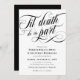 Elegant Halloween eller bröllopsinbjudan med Til död gör oss en del skriven i ett snabbt svart kalligrafi-skript. Lägg till inbjudan i svart mot en vit bakgrund. Inbjudan dina gäster till ditt gotiska bröllop med denna romantiska tills döden gör att vi delar bröllopsinbjudan med en kombination av ett snabbt kalligrafiskript och elegant typsnitt i svart och vitt.
