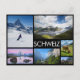 Photo postcard of a collage with multiple photos of Switzerland, like Matterhorn mountain, Aletsch glacier, Bernese Oberland, Blatten village and Lauterbrunnen valley, with a black frame and the text: 'Schweiz' (swiss for 'Switzerland').