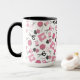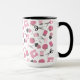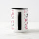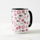En mugg som presenterar en themed design för sömnad som består av en symaskin, köar av tråden, en klämma fast dämpar, sax, tygprovkartor och att sy nålar. Designen har en rosa färgintrig.