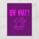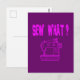 Vykort Grattis-kort tryckt med "Sew What ?" kreativ text, fras, pun, frågetecken och illustration av en symaskin i grafisk design av TheFabricSeal tryck på begäran-butik på Zazzle.com #ZazzleMade https://www.zazzle.com/store/thefabricseal TheFabricSeal©️Original.