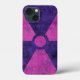 Distressad strålningssymbol i rött och lila.