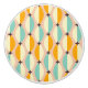 Symmetrical retro pattern with interlocking teal, yellow, and orange shapes on a beige background. Black star-like accents add contrast, creating a vintage feel.