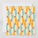 Symmetrical retro pattern with interlocking teal, yellow, and orange shapes on a beige background. Black star-like accents add contrast, creating a vintage feel.