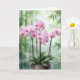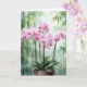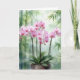 A potted orchid plant featuring delicate pink blossoms set against an abstract green bamboo background.