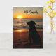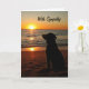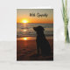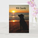 En hund i silhuette sitter på en strand med sol-inställningen. Ord-sympatin överst.