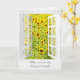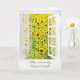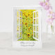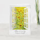 Öppna ett vitt fönster med ren gardiner och gult solrosblomma fält för sympati. All text kan ändras.