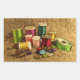 Dessa färgfulla klistermärken visar sömmerskärmens verktyg. Ljusfläckar av tråd i regnbåge färg av grönt, rött, rosa, turkos, gult, guld, blått och orange står bredvid ett mätband, en tunn, knappar och stift. Alla är inställda på en bild av en brunt mönster-bakgrund.