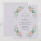Denna botaniska design visar upp en mjuk lila bakgrund accentuerad av persikorösa rosor och salvia gröna suckulenter. Luftig akvarellgrönska och eukalyptusblad skapar en romantisk estetik för en vårfest. Färgpaletten blandar varma koralltoner med svala lila nyanser för en lugn och fantasifull look.