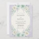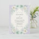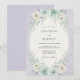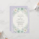 Denna design har en mjuk lavendelbakgrund med en vacker komposition av akvarellflora. Ömtåliga mintgröna rosor och krämfärgade blommor är boende bland silvriga eukalyptusblad och kvistar av lavendel. Den eteriska färgpaletten av pastellviolett, teal och vit skapar en romantisk och lugn atmosfär för en vårhögtid.