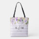 Personliga väskor med monogram är en perfekt present till dina brudtärnor och brölloppsdeltagare. Denna vackra design har en akvarellblomma kant i nyanser av pastellviolett och grönt på en lavendelrandig bakgrund. Personifiera varje väska med dina brudtärnors namn och lägg till brudens och brudgummens initialer och bröllopsdatum på baksidan. Använd designverktygen för att redigera teckensnitt och färger eller ladda upp dina egna foton för att skapa en unik och enastående present till varje medlem i ditt brölloppsparty.