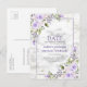 Modern och trendig, denna vackra Fördröj Datum bröllopskortdesign har rustik handstilsbokstäver, en lila ram prydd med syrlilja lila vattenfärgrosor och blommor, på en falsk vit marmorerad textur och guldglitter. Baksidan av vykortet tillåter din returadress och personliga meddelande. Copyright Elegant Invites. Alla rättigheter förbehålls.