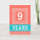Detta är en utmärkande och attraktiv design i korall, vita och turkosa. Siffran 9, i vitt, ställs in inom ett fyrkantigt område som är dekorativt kantat. En del av gränsen utgörs av ett snabbt vinkart mönster och kompletteras med en skiss bestående av GRATTISARNA i ord som är skriven fyra gånger runt kvadraten. Underliggande är texten "ÅR" som ställs mot en turkotisk färgad, som på ett bra sätt står i kontrast till korallets huvudsakliga färg. Under ord "ÅR" motsvarar mönster det som utgör en del av gräns kring nummer 9. Natalie Kinnear Cards
