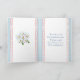 Smärt brud i vit klänning med delikat slöja med prästkragar och hållande en bukett blommor.