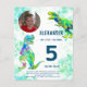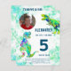 För barnet som fyller 5 och älskar dinosaurier. Dessa färgglada brüllande T Rex inbjuder Dino-fans till en rolig 5-årsfest. Teal vattenfärg stänk bakgrund med Tyrannosaurus rex i livfull blågrön och teal Personifiera denna mångfärgade psykedeliska Tyrannosaurus rex-design med ett foto, födelsedagsnumret och festdetaljerna och du är redo för en rolig dinosaurie-tema dino-födelsedag. Alla dinosauriearter är välkomna. Originalillustration Illustration av Catherine Sweetman