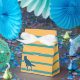 Gult och blå rand mönster, dinosaur T-rex-tecknad, babydusch, pojkfödelsedag