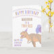 Detta färgstarka dinosauriekort från Grattis på födelsedagen är redo att vara personlig för ditt barn, ditt barnbarn eller barnbarn eller nieces och systerbarn. På framsidan följs GRATTIS PÅ FÖDELSEDAGEN i en färglös båge av färglöst brev av ett utrymme för att lägga till barnets namn i brunt och deras dinosauriålder (ONASAURUS, TWO-REX, TRE-REX, DINO FOUR, FEM ASAURUS osv.) i peachy tan. Den huvudsakliga utformningen av inslag är T-Rex i en party-hatt med ballonger och till den lämnat om honom är färgstark stavning av GRATTIS PÅ FÖDELSEDAGEN - lägg till barnets födelsedag (1:a, 2:a, 3:e osv.) i blått och under detta, deras namn igen i lila. Inuti finns utrymme för personlig Grattis på födelsedagen-meddelandet. Den här anpassningsbarna är ett dinosauriefödelsekort sött för pojkar eller flickor med ett brunt, brunt, stunt, blått och lila färg designat tema som är könsneutralt.