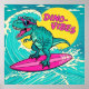 T-Rex med solglasögon som rider på ett neon rosa surfbräda på en turkos våg.