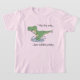 Ein T-Shirt mit einem lustigen Cartoon. T-Rex sptingt in die Pfütze. Text: "T-Rex tiny arms loves puddles jumping"