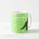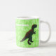 Skapa en personlig som är perfekt för dinosauer fläkt unge och gammal. Mugg har ett foto av en leksak tyranosaurus rex av plast eller t-rex dinosaur i grönt med orangens accenter inställda mot en ljus ljust grönt bakgrund med en mönster av fossilar av dinosauris fotavtryck. Lägg till din egen namn eller annan text i fet vit text.