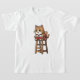 A cute cartoon cat with wide, expressive eyes sits on a tall wooden chair, captured in a moment of pure surprise. The character wears bright red shorts and a small whistle hanging from its neck, adding a playful lifeguard vibe. Soft fur textures, warm brown and cream tones, and clean bold outlines give the illustration a polished, friendly look. The pose, tiny paws, and curious facial expression create a charming and humorous scene that feels lively and full of personality against the dark background.
