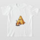 A cheerful and cozy illustration featuring an anthropomorphic yellow tent enjoying a night out. The triangular character sports a beaming smile and blushing cheeks while sitting cross-legged in front of a crackling stone-lined campfire. It happily waves with one hand while roasting a marshmallow on a stick with the other, capturing the pure joy of camping against a solid black background.