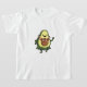 A cheerful cartoon avocado character in a hula dancer outfit. The smiling fruit mascot is wearing a green leaf grass skirt and a vibrant lei made of red and white hibiscus and frangipani flowers while dancing and waving.
