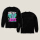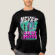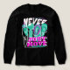 The design is a masterpiece of modern "glitch" and Y2K-inspired typography. The word "NEVER" is rendered in a sharp, white jagged font, while a massive, stylized teal "STOP" dominates the background. The call to action, "JUST MOVE," anchors the bottom in a bold, vibrant pink serif font.