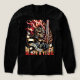 The centerpiece features a formidable skeletal warrior in dark, ornate plate armor. Emerging from the helmet is a massive, roaring plume of fire in shades of yellow, orange, and red. The knight firmly grips a colossal broadsword that glows with magical red energy, set against a golden circular halo background.