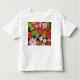 En t-shirt med röd- och rosa blommor i Petrykivka stil mot svart bakgrund. Det invecklade blommönstret kännetecknas av pulserande, detaljerade penseldrag, med känsliga löv och knoppar som accentuerar blommorna. Det djärva färg står vackert mot mörken, skapar en slående kontrast och en rik.