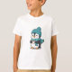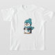 This design features a sweet and chubby cartoon penguin dressed for cold weather. The character is wearing a textured teal knit beanie with a pom-pom on top, along with a matching striped scarf wrapped snugly around its neck. The penguin is holding a white mug filled with a hot, brown beverage that is emitting steam lines, suggesting coffee or hot cocoa. With closed smiling eyes and rosy pink cheeks, the penguin has a delighted and cozy expression, radiating warmth and happiness against a simple background.