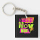 The centerpiece of this design is a dynamic typographic collage that breaks conventional layout rules to convey speed and motion. The word "KEEP" is rendered in a heavy hot pink block font, while "MOVING" is stacked below in a brilliant neon lime green, featuring a mix of sharp serifs and wavy, distorted letters.
