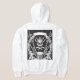 Bilden har en dramatisk och detaljerad, heraldisk design. I mitten ljuger en skalle försedd med krona och horn, omgiven av en ring av korsade ord, axlar och pistoler. Nedan står två heraldiska lejon vakt över en trumma. Designen återges i svartvitt och skapar en slående kontrast mot mörkens bakgrund
