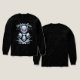 The centerpiece features a menacing central skull with a stitched forehead, flanked by two smaller skulls engulfed in stylized purple flames. A fourth skull sits below them, anchored by two crossed skeletal hands flashing the "rock on" sign.