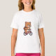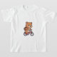 This energetic artwork features a happy brown teddy bear enjoying a ride on a classic red bicycle. The character beams with joy, sporting a wide smile and blushing cheeks while gripping the handlebars. A brown travel backpack is strapped to its back, suggesting a fun adventure ahead. The illustration showcases clean lines and vibrant colors, detailing the bike's frame, pedals, and front headlight, perfectly capturing a moment of playful motion and cuteness.