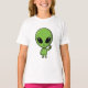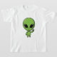 A cute green alien stands cheerfully against a deep black background, flashing a friendly peace sign. Its oversized head, smooth round shape, and large glossy black eyes give it a playful, approachable personality. Subtle highlights and clean outlines create a polished cartoon look, while the simple pose and bright green color make the character feel lighthearted and fun. The overall illustration blends sci‑fi charm with adorable kawaii style.