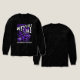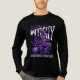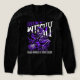 The centerpiece of this design features a highly detailed skeleton witch dressed in a flowing purple cloak and a tattered witch's hat. The skeletal figure is captured mid-flight, clutching a rustic broomstick as it soars through a trail of purple magical energy and splatters.