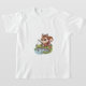 An adorable cartoon squirrel character sitting on a grassy bank and fishing in a small pond. The cute animal wears a small hat and holds a fishing rod with an acorn attached to the line acting as a bobber. The peaceful nature scene includes floating lily pads, blue water with reflections, and a red spotted mushroom growing on the grass.