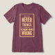T-shirt med ett fet, humoristiskt meddelande som skrivs ut med ett vintage-stil-teckensnitt. Texten lyder: "Du kommer aldrig ut springa från sak som kan gå fel", som ramats in i ett rektangulärt gräns. Designen användor ett kontrasterande ljussken färg för texten, skapar den mot mörkens bakgrund. Uttrycket fångar en lätt sarkastisk och lättvindig utmaning för livet, och svarar mot alla som har drabbats av oväntade bakslag. Det är ett gigantiskt och relativt påstående som ofta används för att uttrycka återhämtningsförmåga eller humor i tuffar.