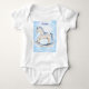 Celebrate the arrival of a new little one with this editable baby bodysuit, featuring a charming chinoiserie rocking horse illustration set against a soft pastel blue watercolor background.