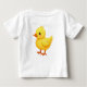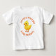 T-shirt blanc en jersey fin pour bébés avec devant le dessin d'un poussin jaune avec écrit en cercle "LE PETIT POUSSIN À SES PARENTS" et dans le dos, un poussin jaune seul