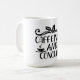 The centerpiece of this design is the empowering mantra "CAFFEINATE AND CONQUER," rendered in a playful yet sophisticated black serif font. The layout is balanced by charming coffee-themed illustrations, including two steaming cups of coffee on saucers and a decorative coffee bean flourish at the top with elegant swirls.