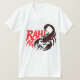 En nära förestående man med vit t-shirt med fet grafisk design av en skorpion i rött och svart.