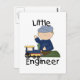 En liten lokförare leker med ett tåg och text i barnstil som lyder "Liten ingenjör" på T-shirts, bodysuits, muggar, kort, klistermärken, tote bags och andra föremål som barn och småbarn som älskar tåg säkert kommer att älska!