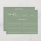 Kortet Sage Minimalist Script Möhippa Recipe Card är ett val av snyggt och elegant för vilken brid som helst som ska vara speciell dag. Med sin enkla och moderna utformning med ett vackert färg och ett minimalistiskt skript är dessa receptkort perfekt för att fånga omhuldade familjerecept eller begära nya från omtyckta under en möhippa.