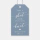 Få party att börja med dessa söta favorittaggar designade att fästa på bildglasögon eller mini-likör flaskor. Designfunktionerna "ta ett skott, vi är gifter sig" i ett vitt klassiskt serif och calligraphy-skript med text på en dammig blå bakgrund med ett litet hjärta. Anpassa med din namn och bröllop-dejt. Perfekt till bröllop välkomstpåsar, favörer eller repetitionsmiddagar.