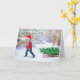 Detta julkort skapades från ett fotografi av en pojke och släde med snötäckt skog i bakgrunden. Jag lade till den nyss kapade julgranen i släden och en kardinalfågel. (Pojke som tar hem julgran) Det finns en innergreeting "Må ditt hem vara varmt och fyllt med kärlek på julafton."