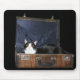 Svart och vit katt i en gammal resväska i munstycket