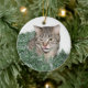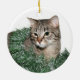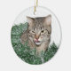 Tabby katt i dekorationen på julgranskläder. Liknande foto på vardera sidan, en med munnen stängd och den andra sidan med tunga ut